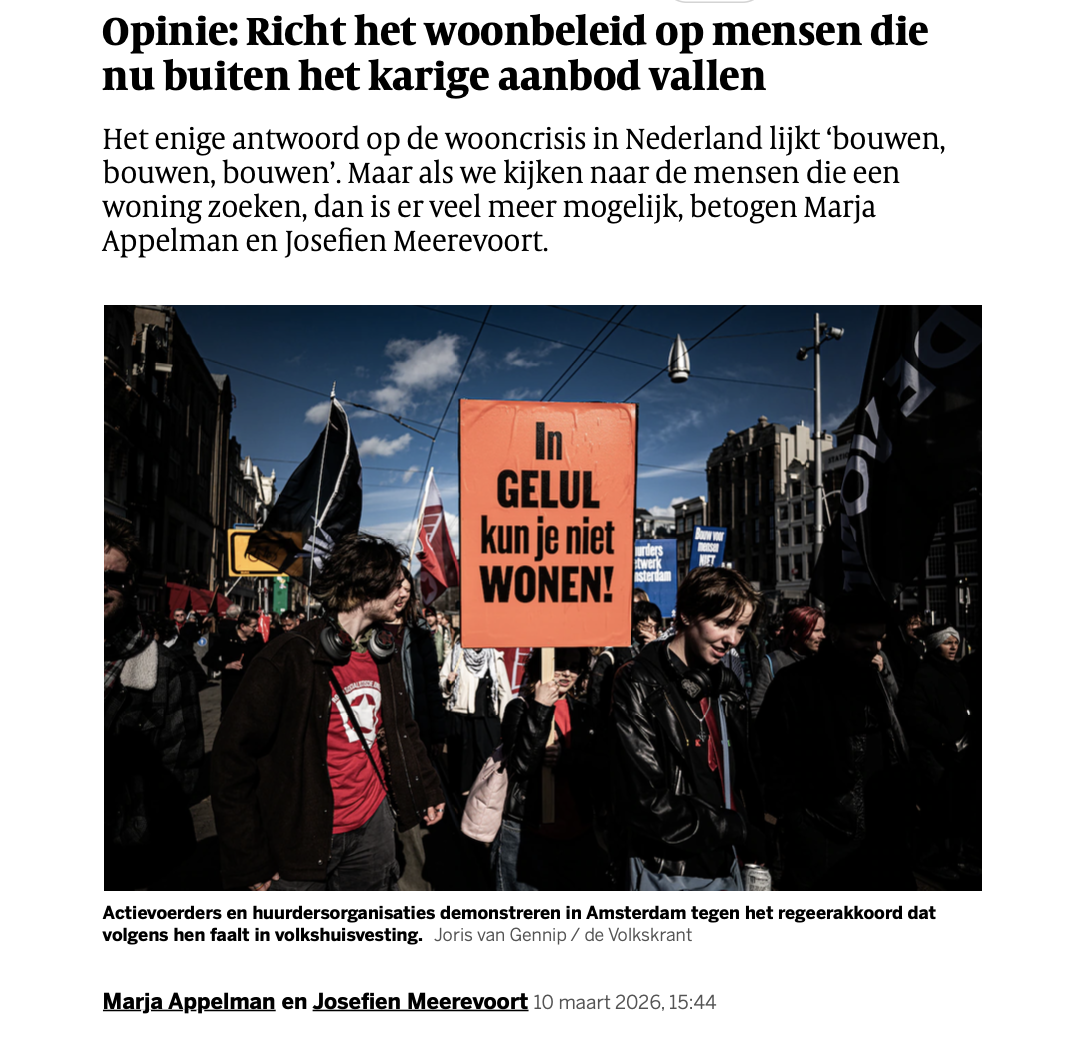 In de Volkskrant pleitten denktanklid Marja Appelman (Platform31) en fabrieker en auteur Josefien Meerevoort in hun opinie “Richt het woonbeleid op mensen die nu buiten het karige aanbod vallen” voor een woonbeleid dat verder kijkt dan alleen bouwen, bouwen, bouwen.